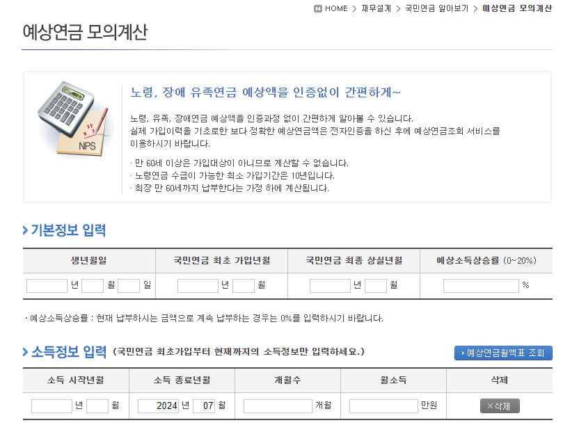 ✅국민연금이나 유족, 장애연금 예상액을 인증 과정 없이 바로 계산할 수 있습니다.