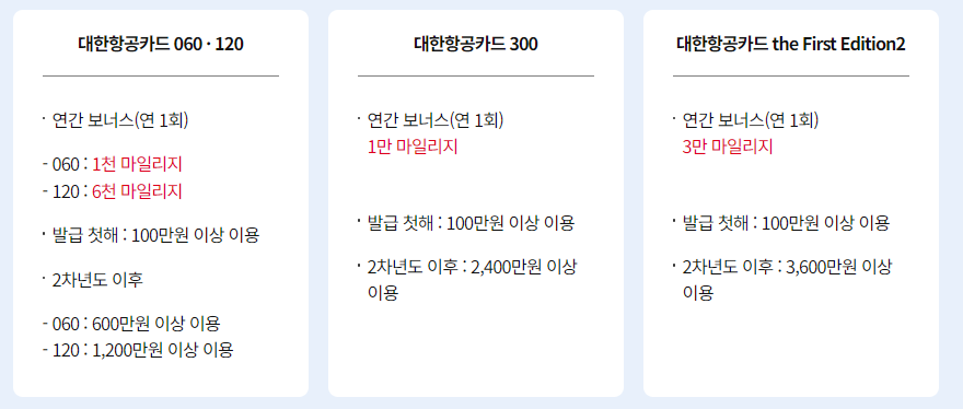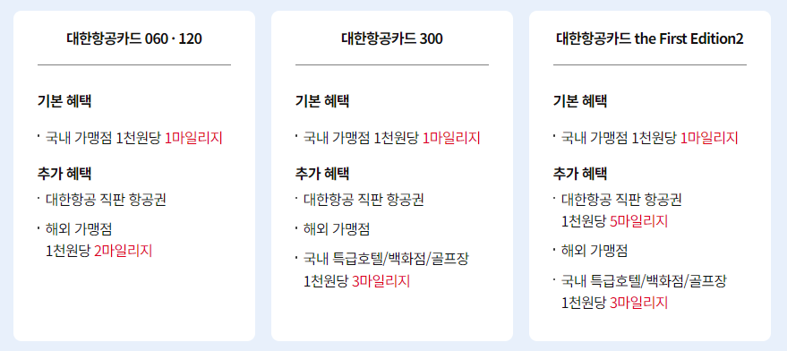 모든 대한항공 카드는 국내 가맹점에서 1,000원당 1마일의 기본 마일리지를 적립합니다.