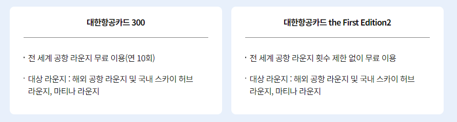대한항공 150 카드는 연 2회의 공항 라운지 이용 혜택을 제공합니다.