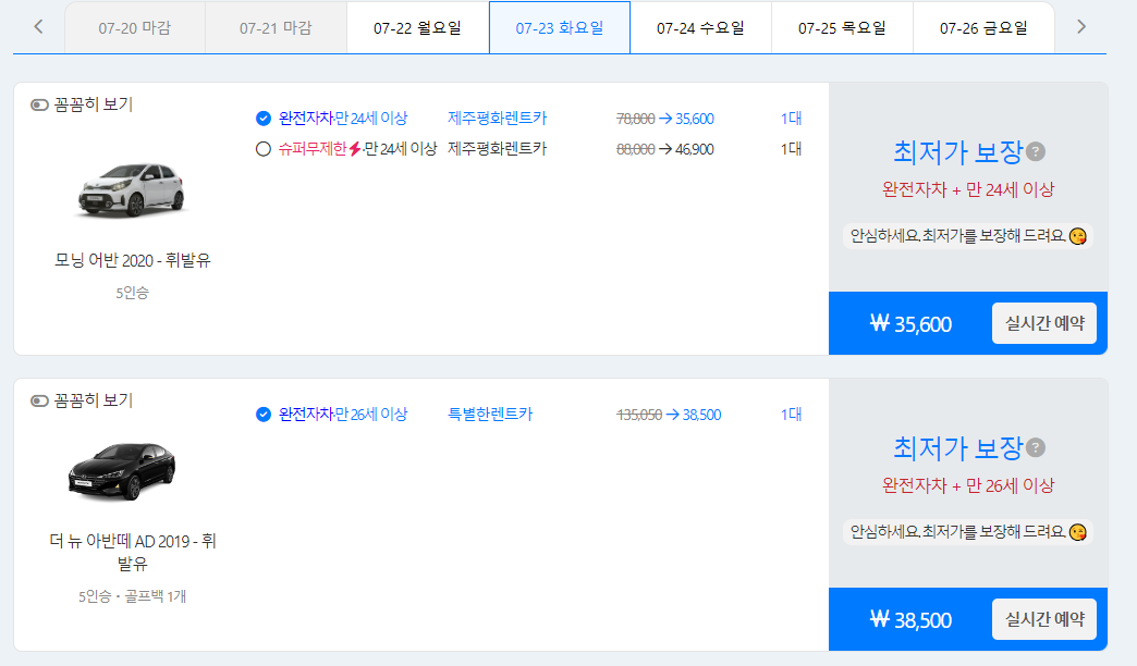 - 선택한 내용을 조회하면 차량 리스트가 쭉 나옵니다.