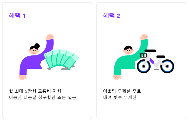 혜택은 월 최대 5만원의 교통비를 지원받을 수 있습니다.