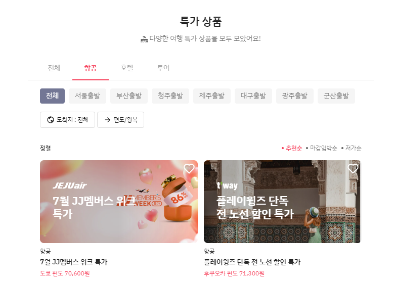 위처럼 항공, 호텔, 투어의 특가 상품을 한눈에 볼 수 있습니다.
